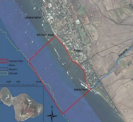 Polanui Hiu is located in Lahaina, Maui. The project area extends from the high water mark to 70 feet in depth and from Mākila Point to the pūnāwai (water spring) fronting 505 Front Street. The area encompasses 222 acres of sandy and rocky beach and fringing and patch coral reefs. This area is small enough to be manageable by the community group and large enough to show biological gains under the appropriate strategies.